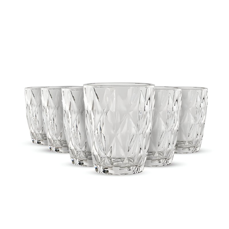 Os copos do conjunto Em Casa com Diamond apresentam um design único, com desenhos em formato de diamantes que refletem a luz de maneira deslumbrante. Cada copo se transforma em uma peça decorativa reluzente, perfeita para elevar o visual da sua mesa.